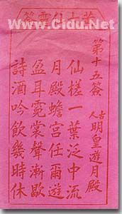 但此签只道繁华快活之象,唐明皇得一叶仙舟,扶摇直上九霄,遨游月宫,仙乐飘飘处处闻,传说中,“霓裳羽衣曲”就因此而得,诗酒歌舞,无止无休。求得此签,虽有大吉大利之象,万事如意,但要警惕勿太沉迷酒色安乐。