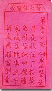 这支签,记述苏东坡游赤壁的赏心乐事:秋月照在江水,与好朋友泛舟垂钓,居然钓到极品“四腮胪”,于是,把家藏的旧酒拿出来,与大家分享,共度这段欢乐时光。